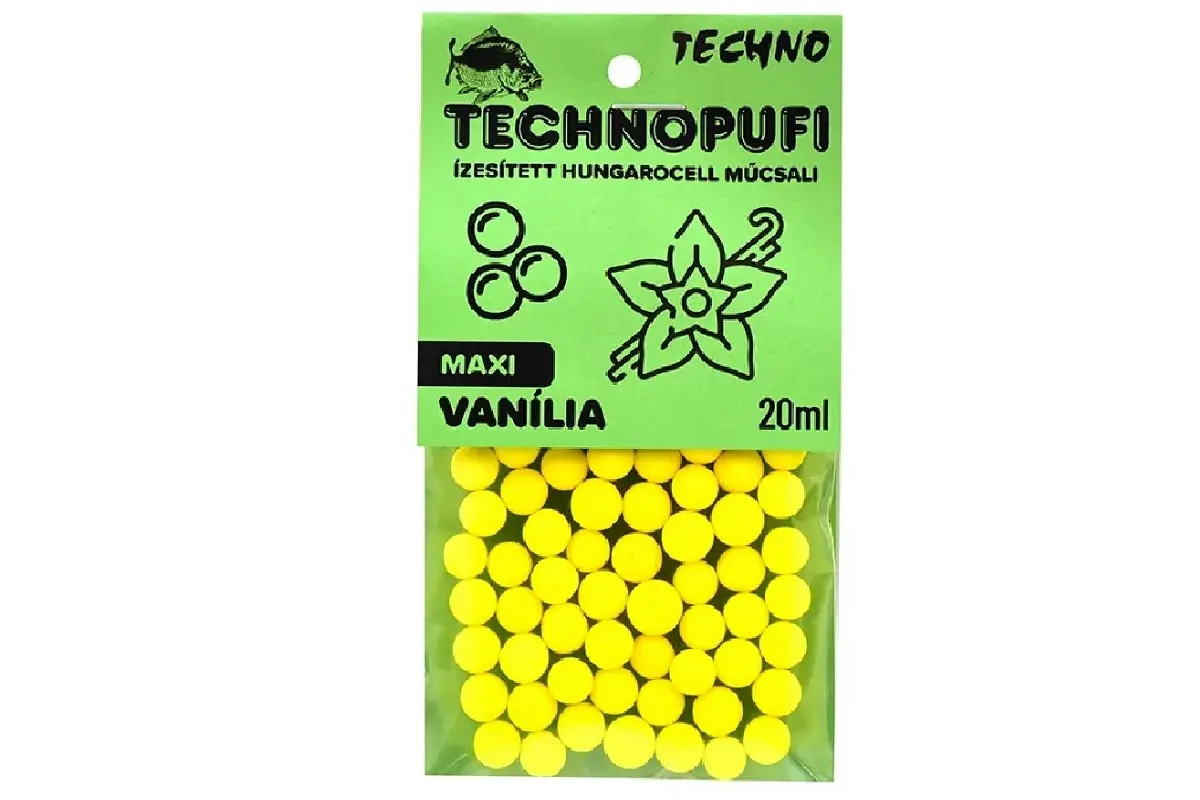 TechnoPufi Vanilie Maxi Galben este creat pentru pescuit staționar la crap și pești albi. Flotabilitatea ridicată și aroma dulce de vanilie ajută pescarul să obțină trăsături rapide și să mențină interesul peștilor pe vad, inclusiv în perioadele mai reci.